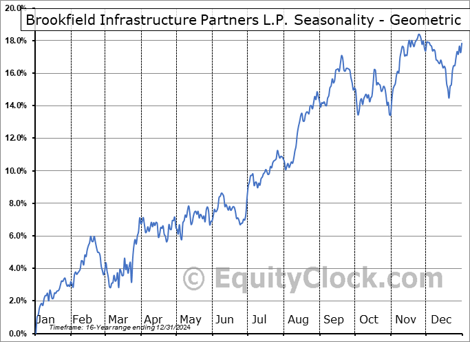 Analysis of the Brookfield Infrastructure Partners L.P. (NYSE:BIP) seasonal charts above shows that a Buy Date of December 22 and a Sell Date of March 13 has resulted in a geometric average return of 4.62% above the benchmark rate of the S&P 500 Total Return Index over the past 16 years. This seasonal timeframe has shown positive results compared to the benchmark in 14 of those periods. This is a very good rate of success and the return strongly outperforms the relative buy-and-hold performance of the stock over the past 16 years by an average of 2.75% per year.