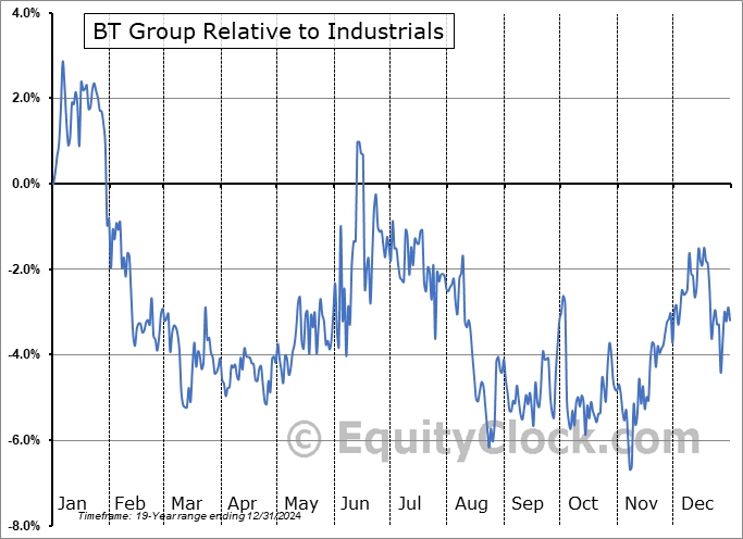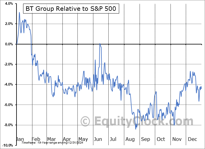 Analysis of the BT Group (OTCMKT:BTGOF) seasonal charts above shows that a Buy Date of October 14 and a Sell Date of January 19 has resulted in a geometric average return of 3.8% above the benchmark rate of the S&P 500 Total Return Index over the past 19 years. This seasonal timeframe has shown positive results compared to the benchmark in 13 of those periods. This is a good rate of success and the return strongly outperforms the relative buy-and-hold performance of the stock over the past 19 years by an average of 14.3% per year.