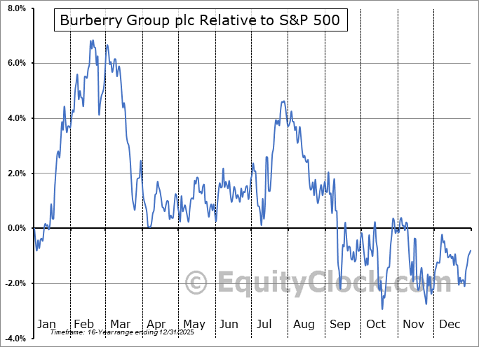 Analysis of the Burberry Group plc (OTCMKT:BURBY) seasonal charts above shows that a Buy Date of November 24 and a Sell Date of February 20 has resulted in a geometric average return of 4.48% above the benchmark rate of the S&P 500 Total Return Index over the past 16 years. This seasonal timeframe has shown positive results compared to the benchmark in 13 of those periods. This is a very good rate of success and the return strongly outperforms the relative buy-and-hold performance of the stock over the past 16 years by an average of 11.75% per year.
