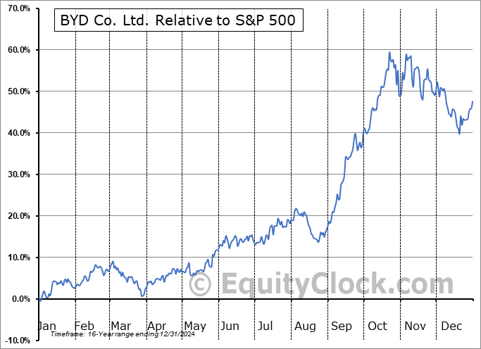 Analysis of the BYD Co. Ltd. (OTCMKT:BYDDY) seasonal charts above shows that a Buy Date of July 27 and a Sell Date of October 18 has resulted in a geometric average return of 10.93% above the benchmark rate of the S&P 500 Total Return Index over the past 16 years. This seasonal timeframe has shown positive results compared to the benchmark in 13 of those periods. This is a very good rate of success and the return strongly outperforms the relative buy-and-hold performance of the stock over the past 16 years by an average of 5.33% per year.