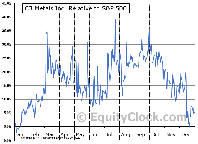Analysis of the C3 Metals Inc. (TSXV:CCCM.V) seasonal charts above shows that a Buy Date of December 21 and a Sell Date of March 10 has resulted in a geometric average return of 16.8% above the benchmark rate of the S&P 500 Total Return Index over the past 13 years. This seasonal timeframe has shown positive results compared to the benchmark in 10 of those periods. This is a good rate of success and the return strongly outperforms the relative buy-and-hold performance of the stock over the past 13 years by an average of 51.93% per year.