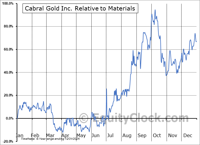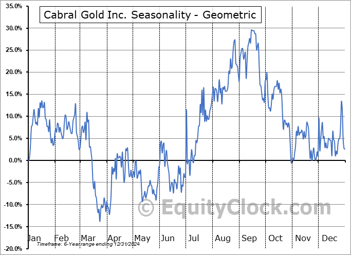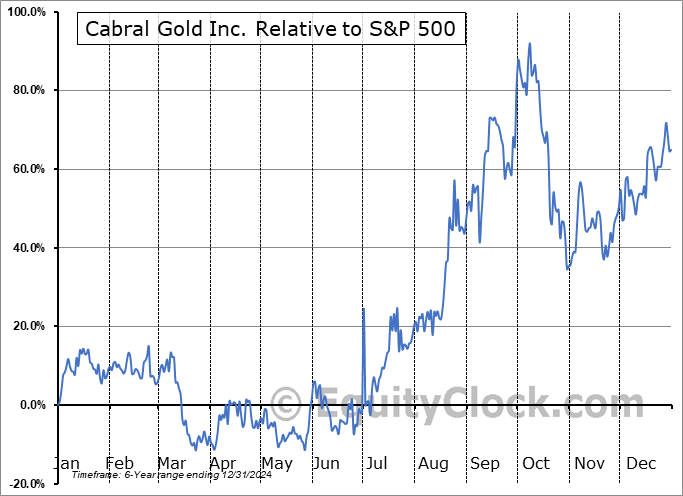 Analysis of the Cabral Gold Inc. (OTCMKT:CBGZF) seasonal charts above shows that a Buy Date of May 27 and a Sell Date of September 18 has resulted in a geometric average return of 35.08% above the benchmark rate of the S&P 500 Total Return Index over the past 6 years. This seasonal timeframe has shown positive results compared to the benchmark in 5 of those periods. This is a very good rate of success and the return strongly outperforms the relative buy-and-hold performance of the stock over the past 6 years by an average of 47.78% per year.