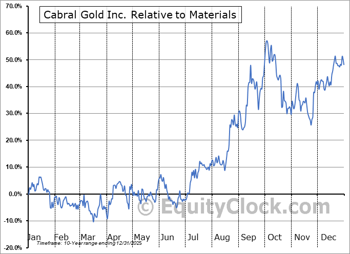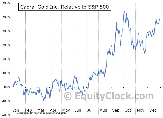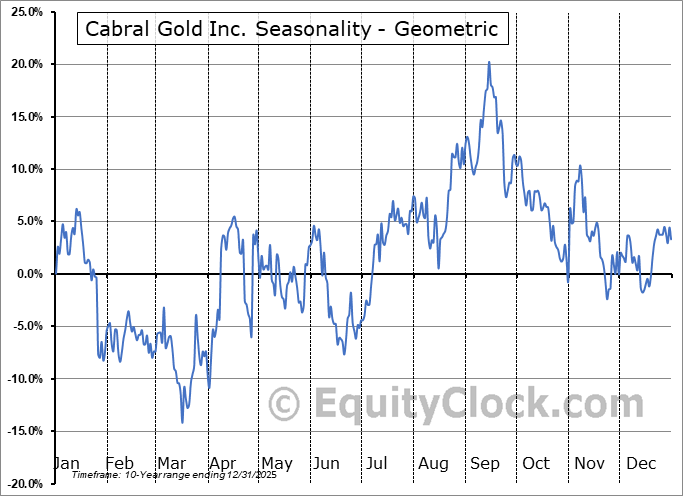 Analysis of the Cabral Gold Inc. (TSXV:CBR.V) seasonal charts above shows that a Buy Date of December 19 and a Sell Date of April 15 has resulted in a geometric average return of 14.83% above the benchmark rate of the S&P 500 Total Return Index over the past 10 years. This seasonal timeframe has shown positive results compared to the benchmark in 9 of those periods. This is an excellent rate of success and the return strongly outperforms the relative buy-and-hold performance of the stock over the past 10 years by an average of 24.93% per year.
