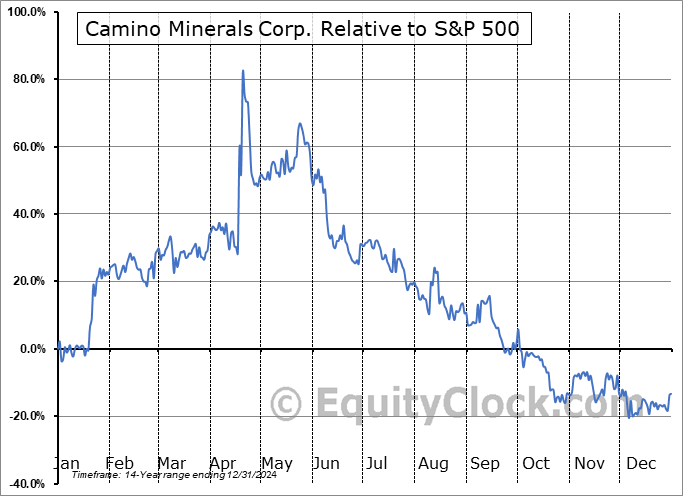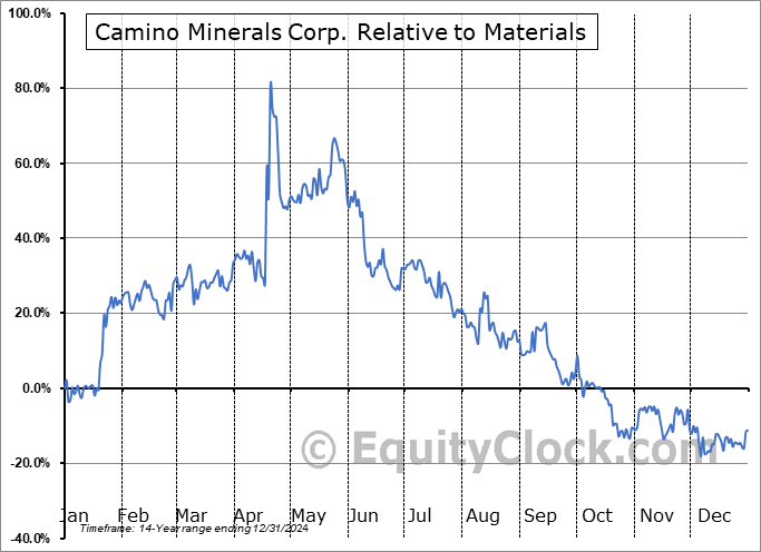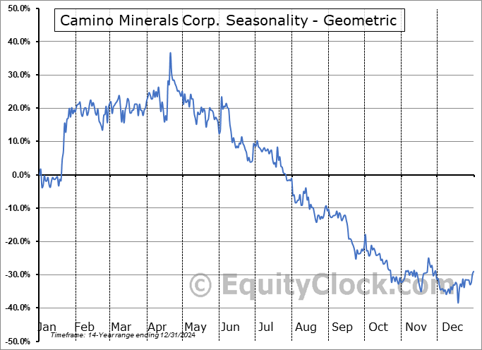 Analysis of the Camino Minerals Corp. (TSXV:COR.V) seasonal charts above shows that a Buy Date of December 18 and a Sell Date of April 3 has resulted in a geometric average return of 38.43% above the benchmark rate of the S&P 500 Total Return Index over the past 14 years. This seasonal timeframe has shown positive results compared to the benchmark in 11 of those periods. This is a good rate of success and the return strongly outperforms the relative buy-and-hold performance of the stock over the past 14 years by an average of 75.89% per year.