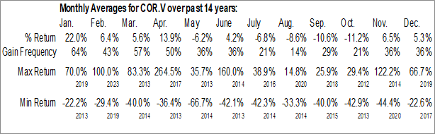 To download COR.V seasonal chart data, please log in or Subscribe.