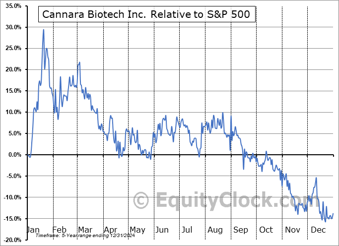 Analysis of the Cannara Biotech Inc. (TSXV:LOVE.V) seasonal charts above shows that a Buy Date of March 26 and a Sell Date of June 14 has resulted in a geometric average return of 1.32% above the benchmark rate of the S&P 500 Total Return Index over the past 5 years. This seasonal timeframe has shown positive results compared to the benchmark in 4 of those periods. This is a very good rate of success and the return strongly outperforms the relative buy-and-hold performance of the stock over the past 5 years by an average of 22.62% per year.