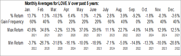 A word of caution: Only 5 years of data is available for shares of LOVE.V, perhaps insufficient to create a seasonal profile that accurately gauges the seasonal tendencies influencing the investment. Ideally, while 20 years is preferred, at least 10 years of data is required to perform a seasonal analysis that is considered to be reliable for future seasonal periods.