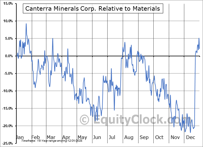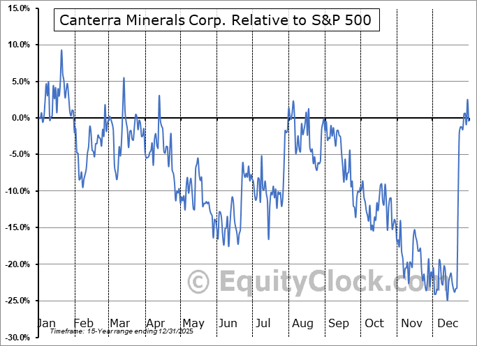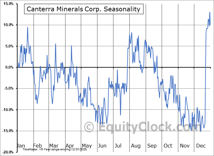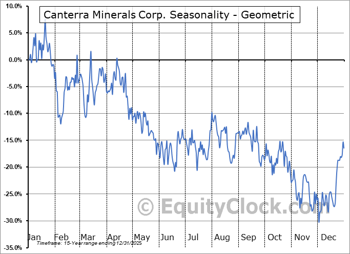 Analysis of the Canterra Minerals Corp. (TSXV:CTM.V) seasonal charts above shows that a Buy Date of November 28 and a Sell Date of February 26 has resulted in a geometric average return of 12.85% above the benchmark rate of the S&P 500 Total Return Index over the past 15 years. This seasonal timeframe has shown positive results compared to the benchmark in 12 of those periods. This is a very good rate of success and the return strongly outperforms the relative buy-and-hold performance of the stock over the past 15 years by an average of 38.86% per year.