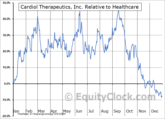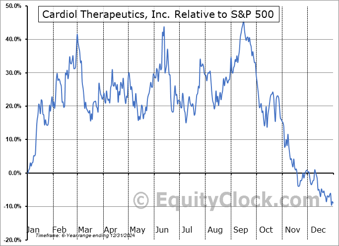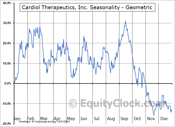 Analysis of the Cardiol Therapeutics, Inc. (TSE:CRDL.TO) seasonal charts above shows that a Buy Date of December 29 and a Sell Date of April 24 has resulted in a geometric average return of 23.85% above the benchmark rate of the S&P 500 Total Return Index over the past 5 years. This seasonal timeframe has shown positive results compared to the benchmark in 5 of those periods. This is an excellent rate of success and the return strongly outperforms the relative buy-and-hold performance of the stock over the past 5 years by an average of 53.94% per year.