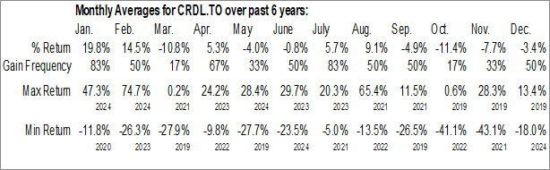 A word of caution: Only 5 years of data is available for shares of CRDL.TO, perhaps insufficient to create a seasonal profile that accurately gauges the seasonal tendencies influencing the investment. Ideally, while 20 years is preferred, at least 10 years of data is required to perform a seasonal analysis that is considered to be reliable for future seasonal periods.