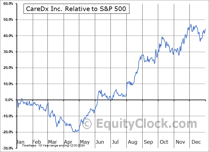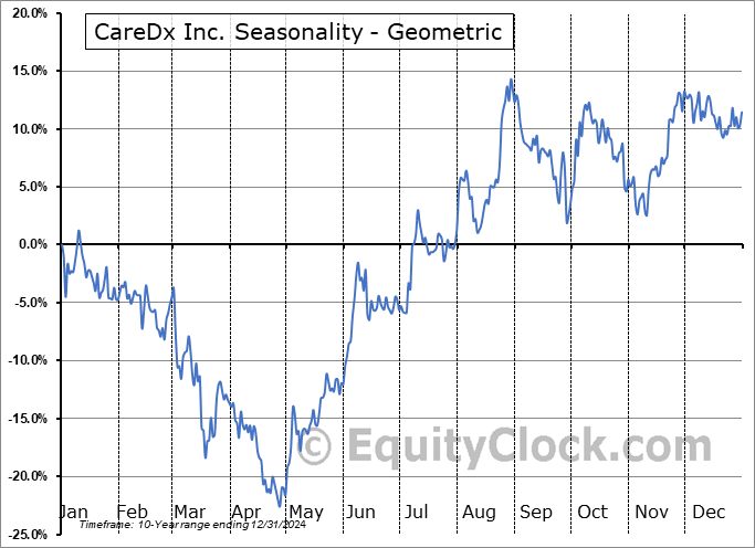 Analysis of the CareDx Inc. (NASD:CDNA) seasonal charts above shows that a Buy Date of May 9 and a Sell Date of August 4 has resulted in a geometric average return of 19.78% above the benchmark rate of the S&P 500 Total Return Index over the past 10 years. This seasonal timeframe has shown positive results compared to the benchmark in 10 of those periods. This is an excellent rate of success and the return strongly outperforms the relative buy-and-hold performance of the stock over the past 10 years by an average of 21.13% per year.