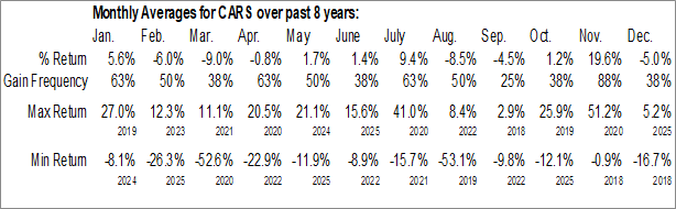 A word of caution: Only 8 years of data is available for shares of CARS, perhaps insufficient to create a seasonal profile that accurately gauges the seasonal tendencies influencing the investment. Ideally, while 20 years is preferred, at least 10 years of data is required to perform a seasonal analysis that is considered to be reliable for future seasonal periods.