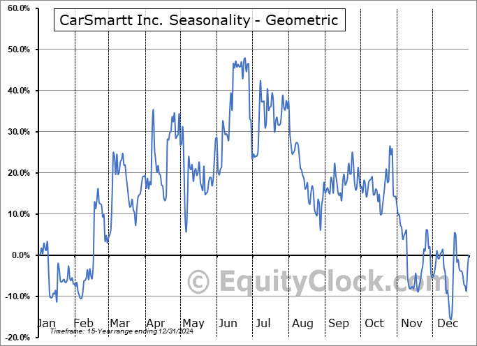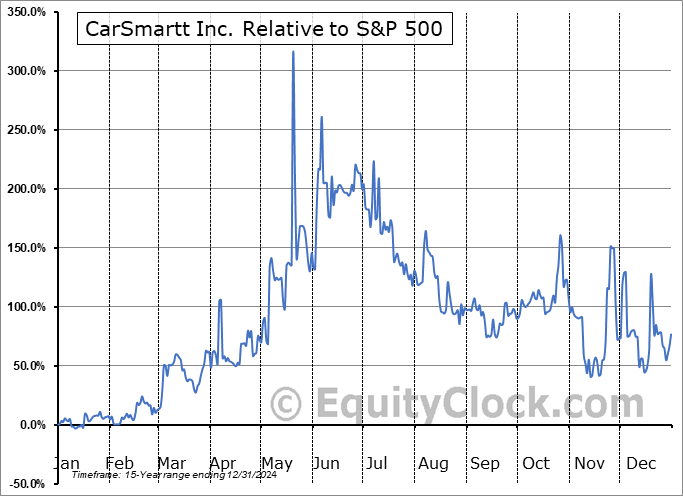 Analysis of the CarSmartt Inc. (OTCMKT:CRSM) seasonal charts above shows that a Buy Date of December 16 and a Sell Date of April 30 has resulted in a geometric average return of 49.84% above the benchmark rate of the S&P 500 Total Return Index over the past 15 years. This seasonal timeframe has shown positive results compared to the benchmark in 12 of those periods. This is a very good rate of success and the return strongly outperforms the relative buy-and-hold performance of the stock over the past 15 years by an average of 61.83% per year.