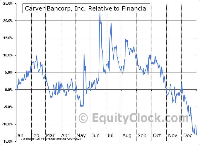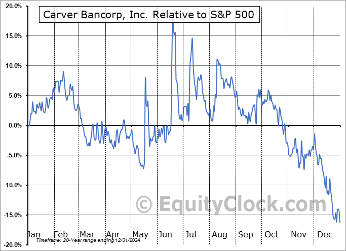 Analysis of the Carver Bancorp, Inc. (NASD:CARV) seasonal charts above shows that a Buy Date of June 9 and a Sell Date of August 28 has resulted in a geometric average return of 2.63% above the benchmark rate of the S&P 500 Total Return Index over the past 20 years. This seasonal timeframe has shown positive results compared to the benchmark in 12 of those periods. This is a fair rate of success and the return strongly outperforms the relative buy-and-hold performance of the stock over the past 20 years by an average of 31.84% per year.