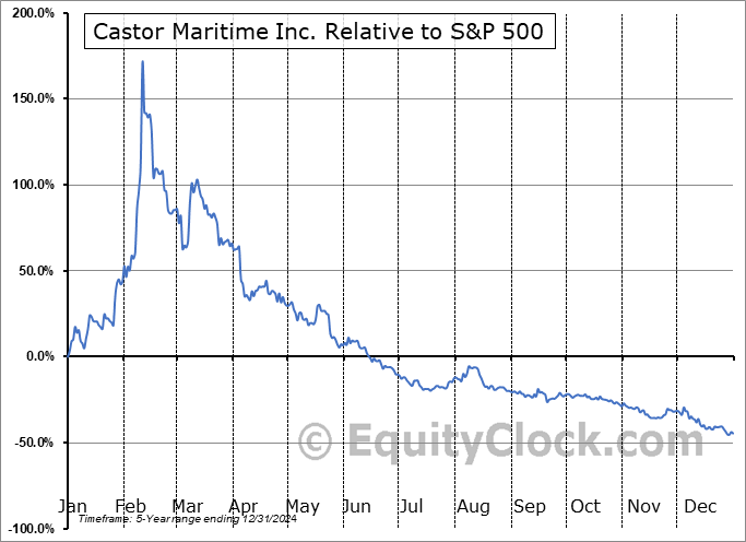 Analysis of the Castor Maritime Inc. (NASD:CTRM) seasonal charts above shows that a Buy Date of December 11 and a Sell Date of March 10 has resulted in a geometric average return of 32.39% above the benchmark rate of the S&P 500 Total Return Index over the past 5 years. This seasonal timeframe has shown positive results compared to the benchmark in 4 of those periods. This is a very good rate of success and the return strongly outperforms the relative buy-and-hold performance of the stock over the past 5 years by an average of 87.37% per year.