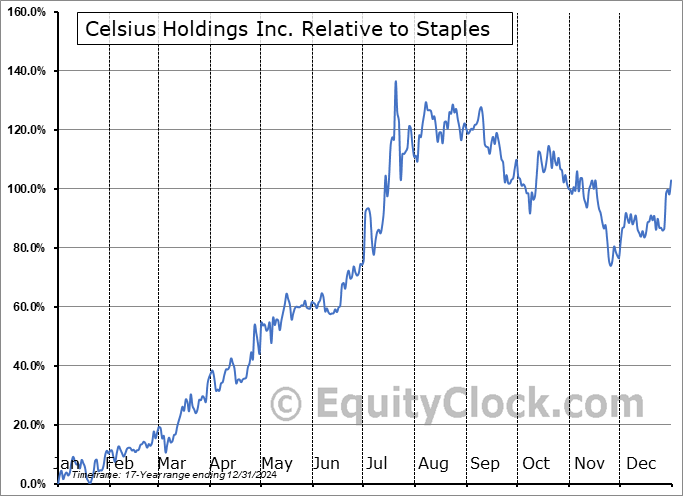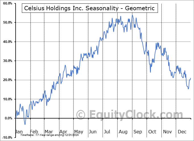 Analysis of the Celsius Holdings Inc. (NASD:CELH) seasonal charts above shows that a Buy Date of January 28 and a Sell Date of June 14 has resulted in a geometric average return of 27.07% above the benchmark rate of the S&P 500 Total Return Index over the past 17 years. This seasonal timeframe has shown positive results compared to the benchmark in 15 of those periods. This is a very good rate of success and the return strongly outperforms the relative buy-and-hold performance of the stock over the past 17 years by an average of 18.29% per year.