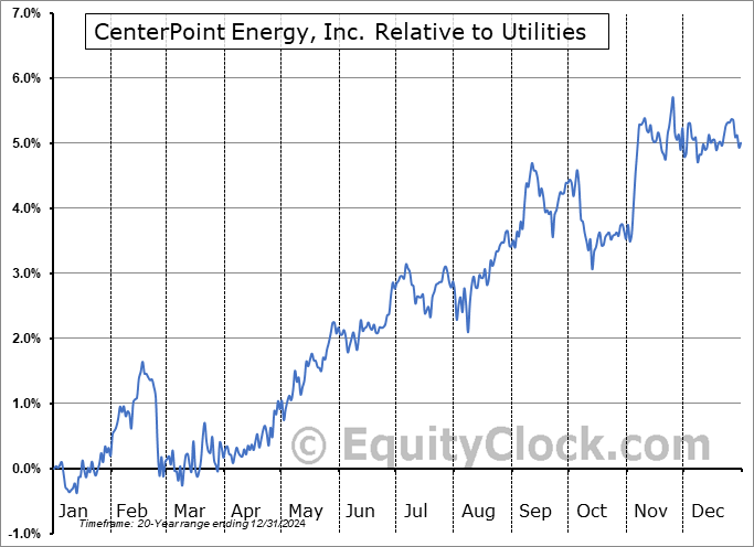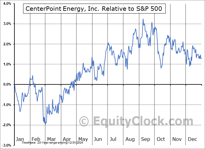 Analysis of the CenterPoint Energy, Inc. (NYSE:CNP) seasonal charts above shows that a Buy Date of March 26 and a Sell Date of July 8 has resulted in a geometric average return of 2.96% above the benchmark rate of the S&P 500 Total Return Index over the past 20 years. This seasonal timeframe has shown positive results compared to the benchmark in 14 of those periods. This is a good rate of success and the return strongly outperforms the relative buy-and-hold performance of the stock over the past 20 years by an average of 3.44% per year.