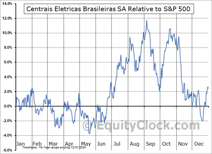 Analysis of the Centrais Eletricas Brasileiras SA (NYSE:EBR/B) seasonal charts above shows that a Buy Date of May 22 and a Sell Date of August 10 has resulted in a geometric average return of 3.52% above the benchmark rate of the S&P 500 Total Return Index over the past 16 years. This seasonal timeframe has shown positive results compared to the benchmark in 11 of those periods. This is a good rate of success and the return strongly outperforms the relative buy-and-hold performance of the stock over the past 16 years by an average of 15.79% per year.
