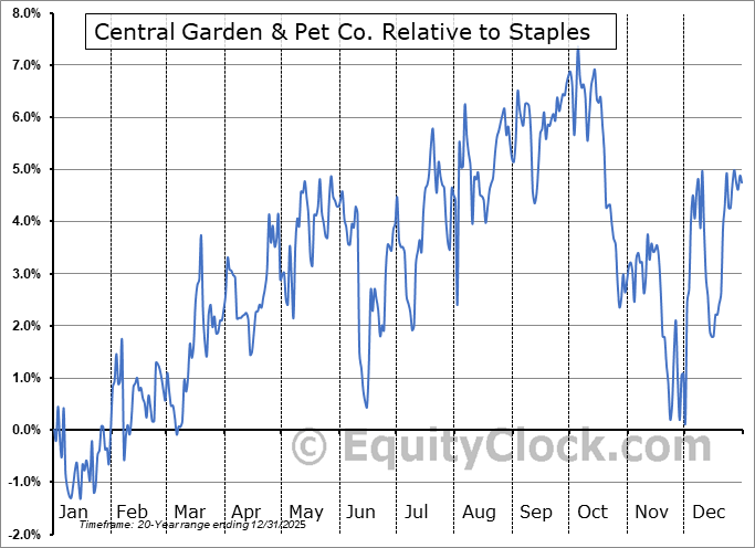 The seasonal timeframe correlates Poorly with the period of seasonal strength for the Consumer Staples sector, which runs from April 25 to November 23. The seasonal chart for the broad sector is available via the following link: Consumer Staples Sector Seasonal Chart.