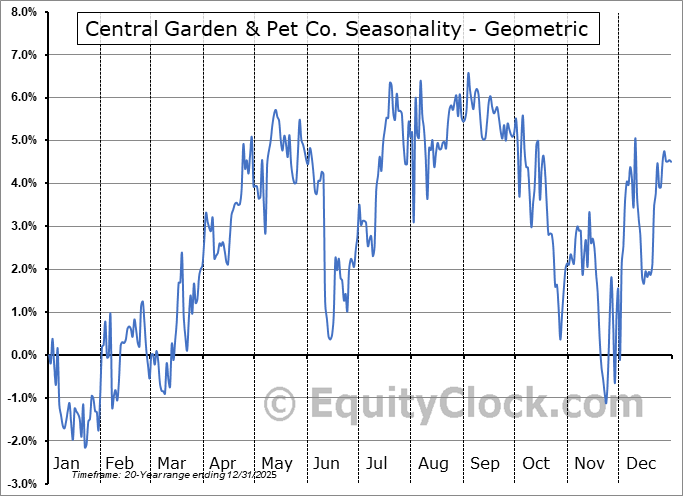 Analysis of the Central Garden & Pet Co. (NASD:CENTA) seasonal charts above shows that a Buy Date of January 23 and a Sell Date of April 21 has resulted in a geometric average return of 2.88% above the benchmark rate of the S&P 500 Total Return Index over the past 20 years. This seasonal timeframe has shown positive results compared to the benchmark in 16 of those periods. This is a very good rate of success and the return strongly outperforms the relative buy-and-hold performance of the stock over the past 20 years by an average of 6.82% per year.