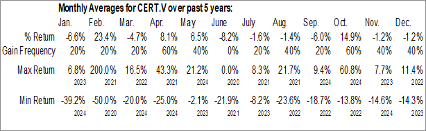 A word of caution: Only 5 years of data is available for shares of CERT.V, perhaps insufficient to create a seasonal profile that accurately gauges the seasonal tendencies influencing the investment. Ideally, while 20 years is preferred, at least 10 years of data is required to perform a seasonal analysis that is considered to be reliable for future seasonal periods.