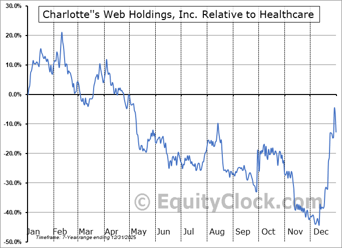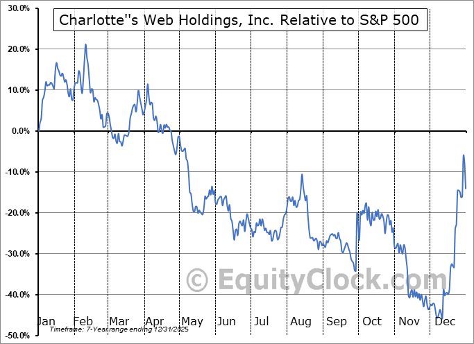 Analysis of the Charlotte”s Web Holdings, Inc. (TSE:CWEB.TO) seasonal charts above shows that a Buy Date of January 1 and a Sell Date of April 3 has resulted in a geometric average return of 2.74% above the benchmark rate of the S&P 500 Total Return Index over the past 6 years. This seasonal timeframe has shown positive results compared to the benchmark in 4 of those periods. This is a good rate of success and the return strongly outperforms the relative buy-and-hold performance of the stock over the past 6 years by an average of 64.55% per year.