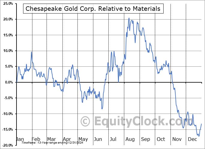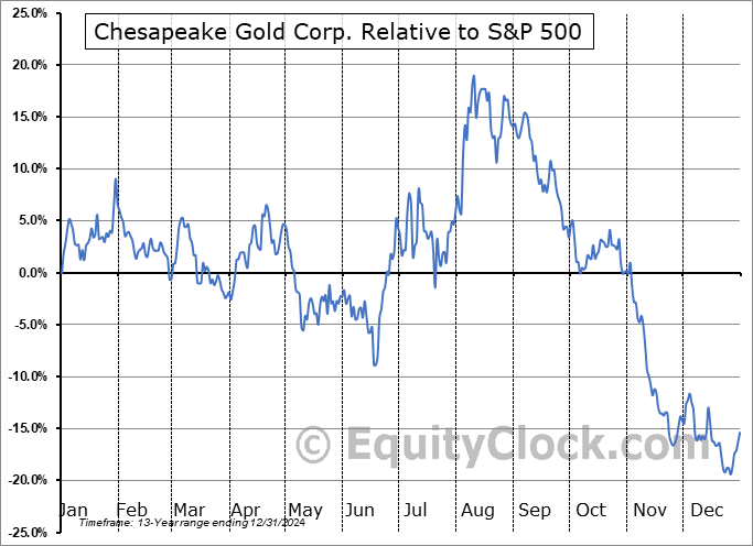 Analysis of the Chesapeake Gold Corp. (OTCMKT:CHPGF) seasonal charts above shows that a Buy Date of June 25 and a Sell Date of September 21 has resulted in a geometric average return of 5.06% above the benchmark rate of the S&P 500 Total Return Index over the past 13 years. This seasonal timeframe has shown positive results compared to the benchmark in 8 of those periods. This is a fair rate of success and the return strongly outperforms the relative buy-and-hold performance of the stock over the past 13 years by an average of 34.47% per year.
