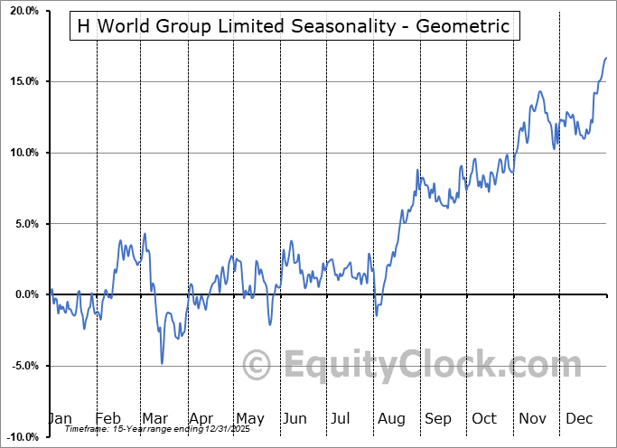 Analysis of the H World Group Limited (NASD:HTHT) seasonal charts above shows that a Buy Date of August 2 and a Sell Date of October 27 has resulted in a geometric average return of 9.36% above the benchmark rate of the S&P 500 Total Return Index over the past 14 years. This seasonal timeframe has shown positive results compared to the benchmark in 11 of those periods. This is a good rate of success and the return strongly outperforms the relative buy-and-hold performance of the stock over the past 14 years by an average of 8.81% per year.