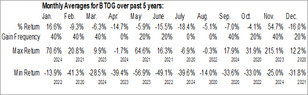 A word of caution: Only 5 years of data is available for shares of BTOG, perhaps insufficient to create a seasonal profile that accurately gauges the seasonal tendencies influencing the investment. Ideally, while 20 years is preferred, at least 10 years of data is required to perform a seasonal analysis that is considered to be reliable for future seasonal periods.