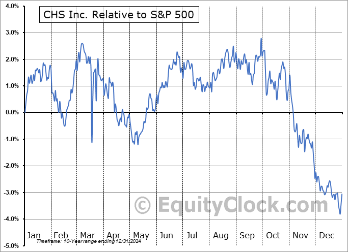 Analysis of the CHS Inc. (NASD:CHSCN) seasonal charts above shows that a Buy Date of December 13 and a Sell Date of March 25 has resulted in a geometric average return of 2.7% above the benchmark rate of the S&P 500 Total Return Index over the past 10 years. This seasonal timeframe has shown positive results compared to the benchmark in 8 of those periods. This is a very good rate of success and the return strongly outperforms the relative buy-and-hold performance of the stock over the past 10 years by an average of 8.57% per year.