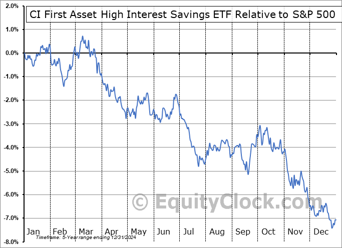 Analysis of the CI First Asset High Interest Savings ETF (TSE:CSAV.TO) seasonal charts above shows that a Buy Date of February 15 and a Sell Date of May 12 has resulted in a geometric average return of 4.89% above the benchmark rate of the S&P 500 Total Return Index over the past 5 years. This seasonal timeframe has shown positive results compared to the benchmark in 3 of those periods. This is a fair rate of success and the return strongly outperforms the relative buy-and-hold performance of the stock over the past 5 years by an average of 15.19% per year.