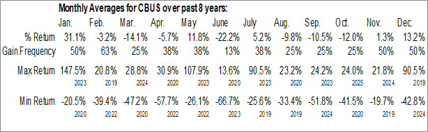 A word of caution: Only 8 years of data is available for shares of CBUS, perhaps insufficient to create a seasonal profile that accurately gauges the seasonal tendencies influencing the investment. Ideally, while 20 years is preferred, at least 10 years of data is required to perform a seasonal analysis that is considered to be reliable for future seasonal periods.