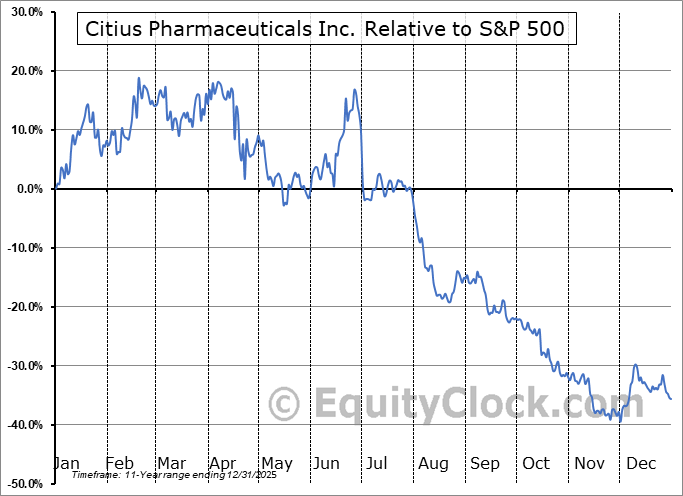 Analysis of the Citius Pharmaceuticals Inc. (NASD:CTXR) seasonal charts above shows that a Buy Date of November 25 and a Sell Date of April 6 has resulted in a geometric average return of 44.49% above the benchmark rate of the S&P 500 Total Return Index over the past 11 years. This seasonal timeframe has shown positive results compared to the benchmark in 9 of those periods. This is a very good rate of success and the return strongly outperforms the relative buy-and-hold performance of the stock over the past 11 years by an average of 94.38% per year.