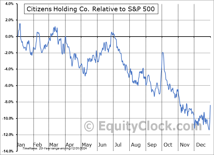 Analysis of the Citizens Holding Co. (OTCMKT:CIZN) seasonal charts above shows that a Buy Date of December 23 and a Sell Date of March 13 has resulted in a geometric average return of 2.4% above the benchmark rate of the S&P 500 Total Return Index over the past 20 years. This seasonal timeframe has shown positive results compared to the benchmark in 14 of those periods. This is a good rate of success and the return strongly outperforms the relative buy-and-hold performance of the stock over the past 20 years by an average of 11.93% per year.