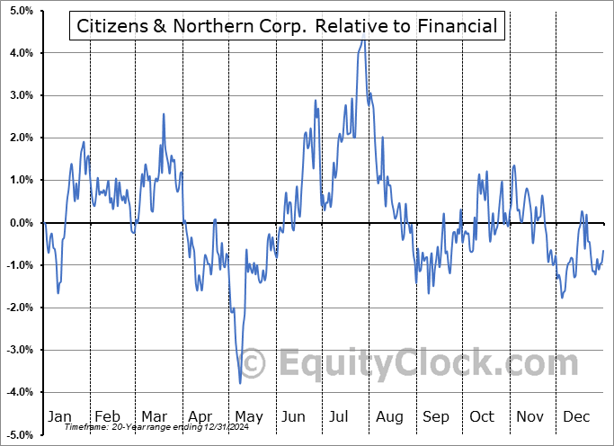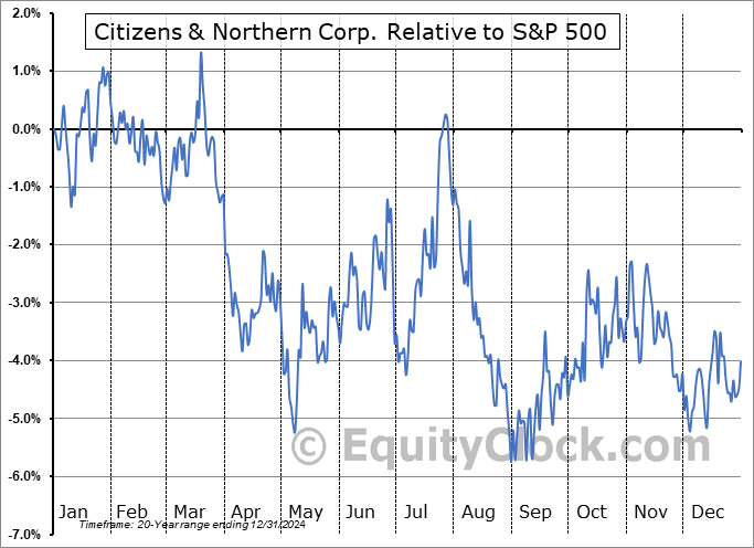 Analysis of the Citizens & Northern Corp. (NASD:CZNC) seasonal charts above shows that a Buy Date of May 8 and a Sell Date of July 29 has resulted in a geometric average return of 4.19% above the benchmark rate of the S&P 500 Total Return Index over the past 20 years. This seasonal timeframe has shown positive results compared to the benchmark in 14 of those periods. This is a good rate of success and the return strongly outperforms the relative buy-and-hold performance of the stock over the past 20 years by an average of 11.06% per year.