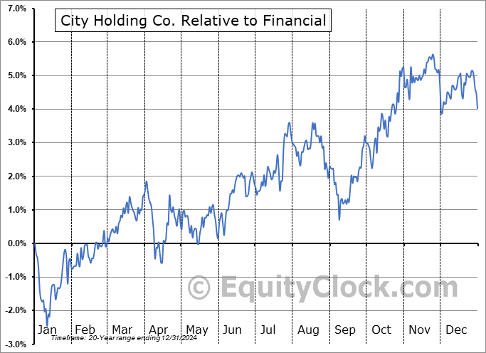 Analysis of the City Holding Co. (NASD:CHCO) seasonal charts above shows that a Buy Date of August 28 and a Sell Date of November 23 has resulted in a geometric average return of 4.2% above the benchmark rate of the S&P 500 Total Return Index over the past 20 years. This seasonal timeframe has shown positive results compared to the benchmark in 17 of those periods. This is a very good rate of success and the return strongly outperforms the relative buy-and-hold performance of the stock over the past 20 years by an average of 4.95% per year.
