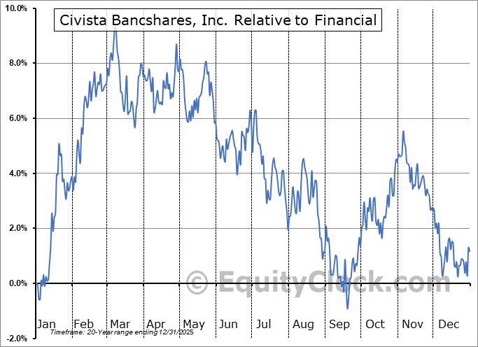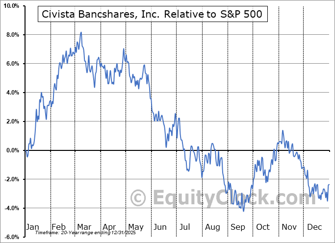 Analysis of the Civista Bancshares, Inc. (NASD:CIVB) seasonal charts above shows that a Buy Date of January 3 and a Sell Date of March 28 has resulted in a geometric average return of 4.54% above the benchmark rate of the S&P 500 Total Return Index over the past 20 years. This seasonal timeframe has shown positive results compared to the benchmark in 16 of those periods. This is a very good rate of success and the return strongly outperforms the relative buy-and-hold performance of the stock over the past 20 years by an average of 11.02% per year.