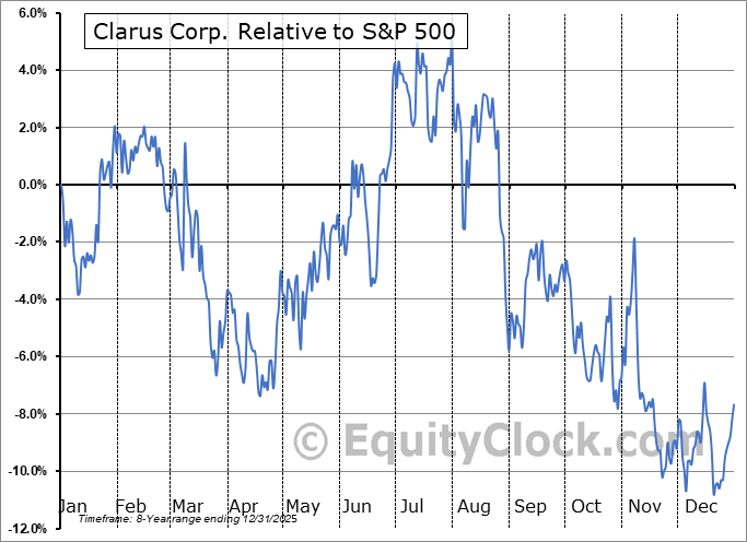 Analysis of the Clarus Corp. (NASD:CLAR) seasonal charts above shows that a Buy Date of November 9 and a Sell Date of February 20 has resulted in a geometric average return of 0.73% above the benchmark rate of the S&P 500 Total Return Index over the past 8 years. This seasonal timeframe has shown positive results compared to the benchmark in 7 of those periods. This is a very good rate of success and the return strongly outperforms the relative buy-and-hold performance of the stock over the past 8 years by an average of 20.58% per year.