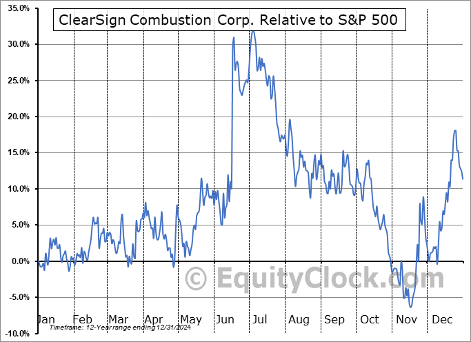 Analysis of the ClearSign Combustion Corp. (NASD:CLIR) seasonal charts above shows that a Buy Date of April 12 and a Sell Date of July 2 has resulted in a geometric average return of 14.93% above the benchmark rate of the S&P 500 Total Return Index over the past 12 years. This seasonal timeframe has shown positive results compared to the benchmark in 9 of those periods. This is a good rate of success and the return strongly outperforms the relative buy-and-hold performance of the stock over the past 12 years by an average of 35.8% per year.