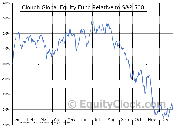 Analysis of the Clough Global Equity Fund (AMEX:GLQ) seasonal charts above shows that a Buy Date of November 16 and a Sell Date of March 4 has resulted in a geometric average return of 1.58% above the benchmark rate of the S&P 500 Total Return Index over the past 19 years. This seasonal timeframe has shown positive results compared to the benchmark in 15 of those periods. This is a good rate of success and the return strongly outperforms the relative buy-and-hold performance of the stock over the past 19 years by an average of 7.97% per year.