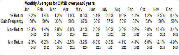 A word of caution: Only 5 years of data is available for shares of CMSD, perhaps insufficient to create a seasonal profile that accurately gauges the seasonal tendencies influencing the investment. Ideally, while 20 years is preferred, at least 10 years of data is required to perform a seasonal analysis that is considered to be reliable for future seasonal periods.