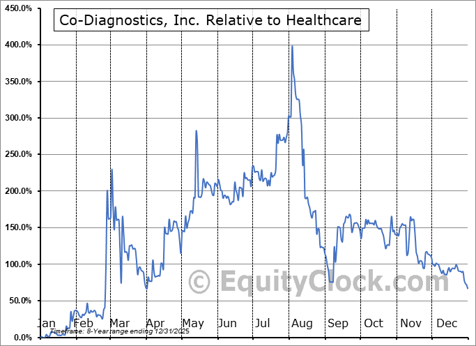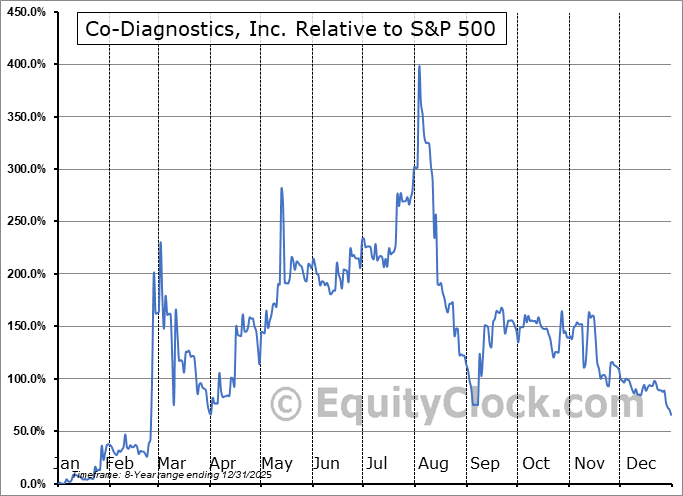 Analysis of the Co-Diagnostics, Inc. (NASD:CODX) seasonal charts above shows that a Buy Date of April 29 and a Sell Date of July 23 has resulted in a geometric average return of 16.93% above the benchmark rate of the S&P 500 Total Return Index over the past 8 years. This seasonal timeframe has shown positive results compared to the benchmark in 6 of those periods. This is a good rate of success and the return strongly outperforms the relative buy-and-hold performance of the stock over the past 8 years by an average of 55.16% per year.
