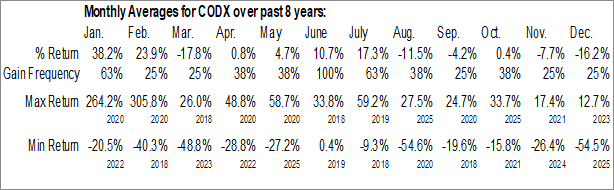 A word of caution: Only 8 years of data is available for shares of CODX, perhaps insufficient to create a seasonal profile that accurately gauges the seasonal tendencies influencing the investment. Ideally, while 20 years is preferred, at least 10 years of data is required to perform a seasonal analysis that is considered to be reliable for future seasonal periods.