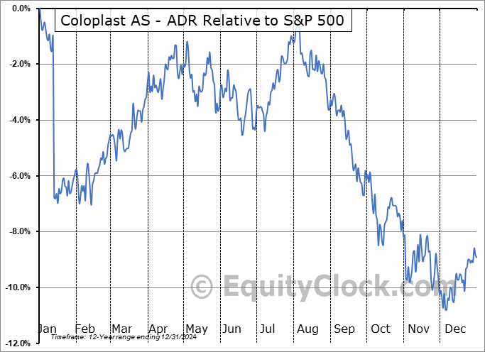 Analysis of the Coloplast AS – ADR (OTCMKT:CLPBY) seasonal charts above shows that a Buy Date of January 24 and a Sell Date of May 3 has resulted in a geometric average return of 6.76% above the benchmark rate of the S&P 500 Total Return Index over the past 12 years. This seasonal timeframe has shown positive results compared to the benchmark in 9 of those periods. This is a good rate of success and the return strongly outperforms the relative buy-and-hold performance of the stock over the past 12 years by an average of 22.64% per year.