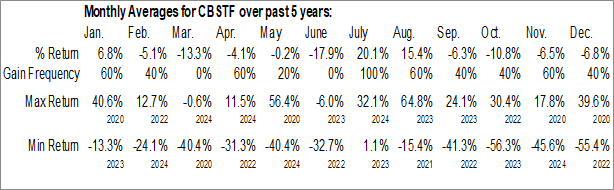 A word of caution: Only 5 years of data is available for shares of CBSTF, perhaps insufficient to create a seasonal profile that accurately gauges the seasonal tendencies influencing the investment. Ideally, while 20 years is preferred, at least 10 years of data is required to perform a seasonal analysis that is considered to be reliable for future seasonal periods.