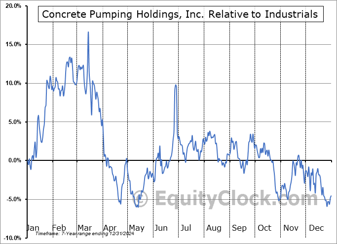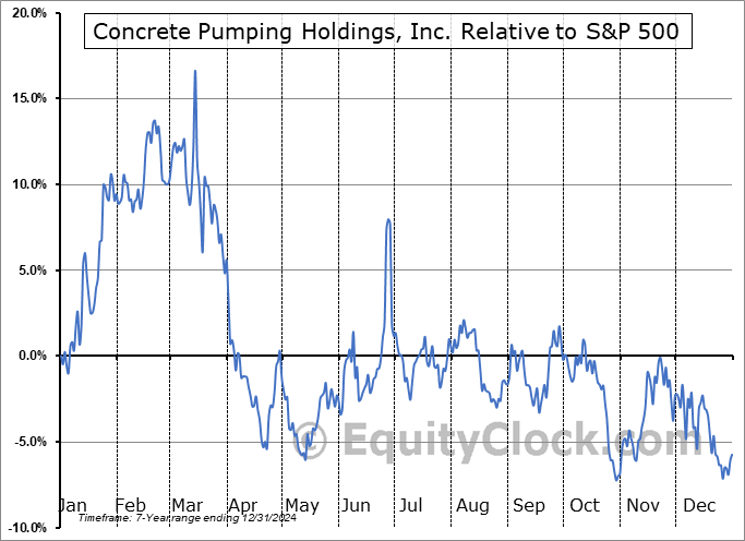 Analysis of the Concrete Pumping Holdings, Inc. (NASD:BBCP) seasonal charts above shows that a Buy Date of December 12 and a Sell Date of March 22 has resulted in a geometric average return of 9.57% above the benchmark rate of the S&P 500 Total Return Index over the past 7 years. This seasonal timeframe has shown positive results compared to the benchmark in 5 of those periods. This is a good rate of success and the return strongly outperforms the relative buy-and-hold performance of the stock over the past 7 years by an average of 26.12% per year.