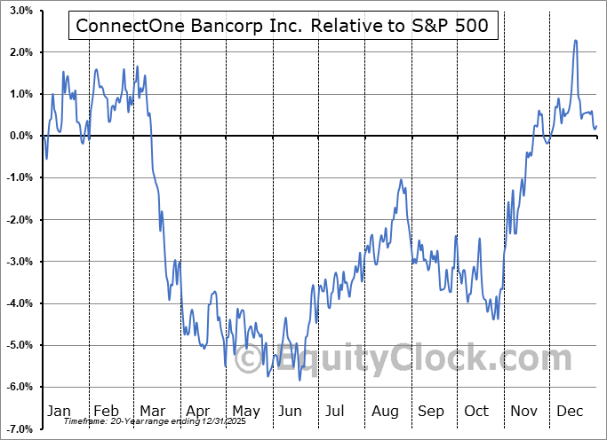 Analysis of the ConnectOne Bancorp Inc. (NASD:CNOB) seasonal charts above shows that a Buy Date of May 30 and a Sell Date of August 22 has resulted in a geometric average return of 4.05% above the benchmark rate of the S&P 500 Total Return Index over the past 20 years. This seasonal timeframe has shown positive results compared to the benchmark in 15 of those periods. This is a good rate of success and the return strongly outperforms the relative buy-and-hold performance of the stock over the past 20 years by an average of 7.44% per year.