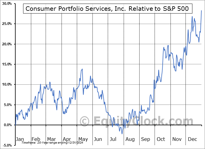 Analysis of the Consumer Portfolio Services, Inc. (NASD:CPSS) seasonal charts above shows that a Buy Date of November 28 and a Sell Date of February 18 has resulted in a geometric average return of 7.83% above the benchmark rate of the S&P 500 Total Return Index over the past 20 years. This seasonal timeframe has shown positive results compared to the benchmark in 15 of those periods. This is a good rate of success and the return strongly outperforms the relative buy-and-hold performance of the stock over the past 20 years by an average of 13.26% per year.