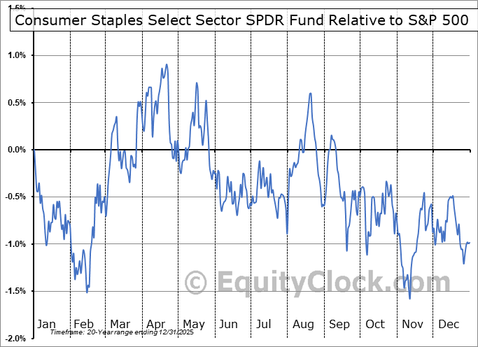 Analysis of the Consumer Staples Select Sector SPDR Fund (NYSE:XLP) seasonal charts above shows that a Buy Date of February 9 and a Sell Date of May 24 has resulted in a geometric average return of 1.23% above the benchmark rate of the S&P 500 Total Return Index over the past 20 years. This seasonal timeframe has shown positive results compared to the benchmark in 16 of those periods. This is a very good rate of success and the return strongly outperforms the relative buy-and-hold performance of the stock over the past 20 years by an average of 2.92% per year.