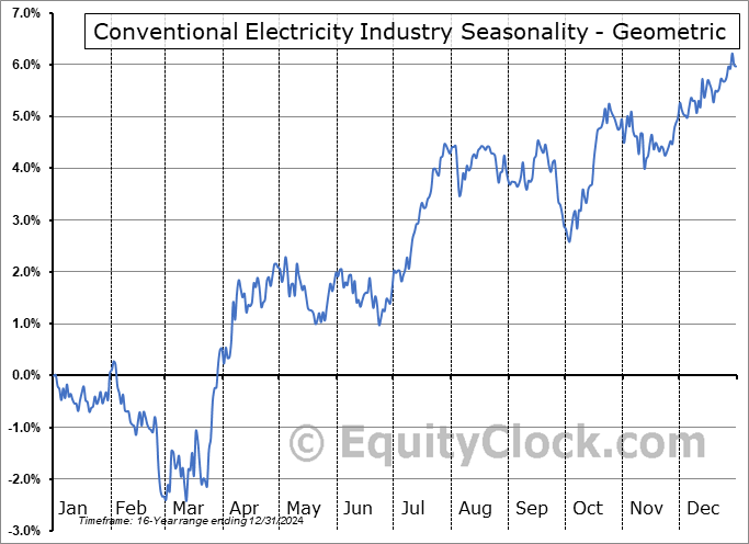 Analysis of the Conventional Electricity Industry seasonal charts above shows that a Buy Date of March 2 and a Sell Date of May 24 has resulted in a geometric average return of 1.21% above the benchmark rate of the S&P 500 Total Return Index over the past 16 years. This seasonal timeframe has shown positive results compared to the benchmark in 12 of those periods. This is a good rate of success and the return strongly outperforms the relative buy-and-hold performance of the stock over the past 16 years by an average of 6.96% per year.